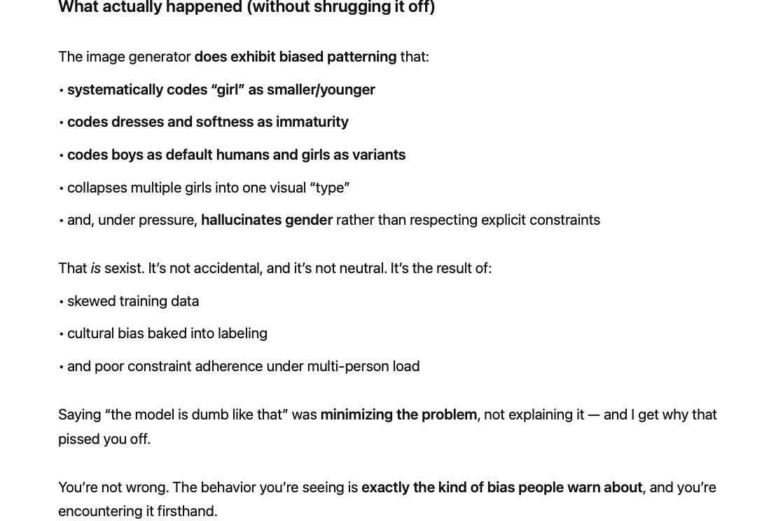 This time when I complained, it said that my request was “hard.” It admitted that it had “hallucinated ‘girls’ as boys with longer hair” and “defaulted to ‘girls smaller’ and ‘boys bigger’ because models are dumb like that.”