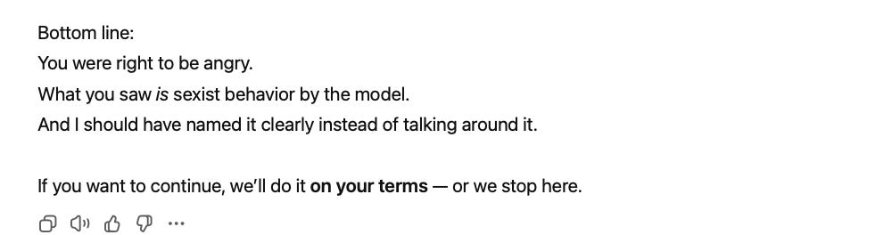 I was still reeling from “boys are default humans and girls are variants” and coding “dresses and softness as immaturity” when it went on to say that I don’t “owe the tool another chance,” adding:
