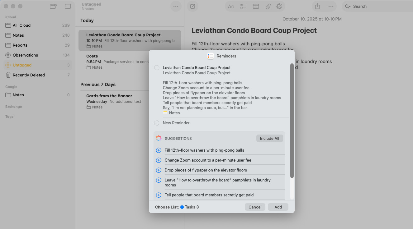 But here’s the twist: Apple’s little AI doesn’t stop at Reminders—it reaches into Notes, too. If you make a list of things you need to do—even buried inside a block of prose—you can hit the share sheet, select Reminders, and watch it parse your note for possible tasks. Pick the ones you want, and they’ll flow straight into Reminders as individual tasks, where the AI can auto-categorize them.
