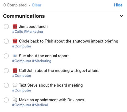 Plus, you still have your standbys: You can find calls on the “Communications” list, errands on the “Errands” list, and so on.