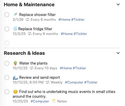 And it kept going. Instead of a single dense block of @Computer tasks, it gave me far more intuitive and helpful categories. Tasks that begin with “write,” “draft,” “edit,” or “design” landed in Creative. Anything that started with “look into,” “find out,” or “read more about” went straight to Research & Ideas. Others dropped neatly into Admin, Financial, and Errands — all thanks to their verbs and other phrases.