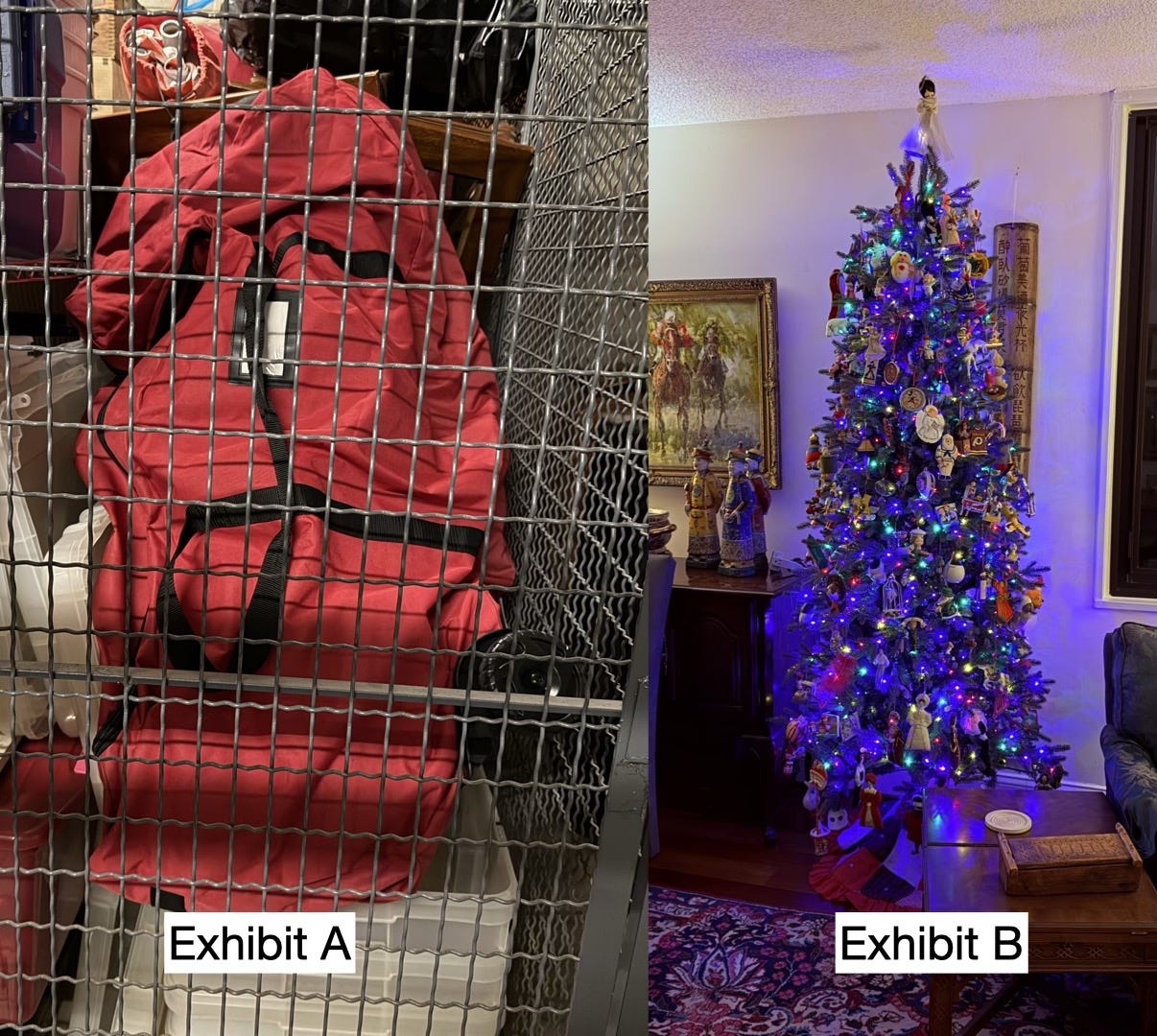 Disapproving man in a leather jacket and fedora eyeing my Christmas tree bag: “What, pray tell, is that?”
